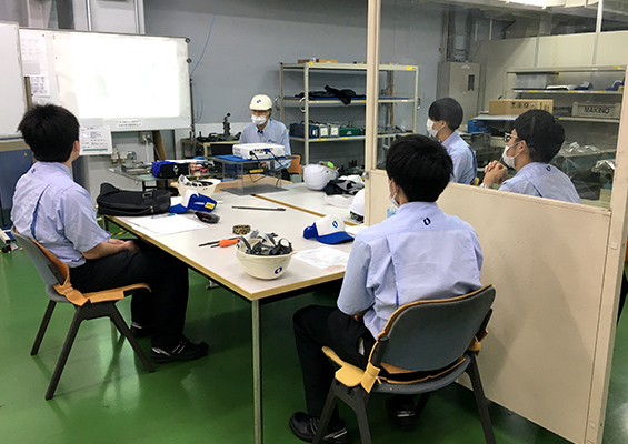 学ぶことは工作機械に関することだけではありません。 社会人として必要な「挨拶」や「礼儀」、また「人前で話す」ということにも、研修期間中の担任役が1年かけてしっかり教えます。